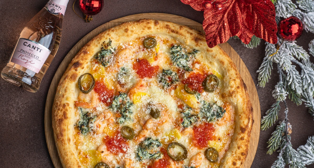 Авторська піца від нашого шеф-кухаря, аналогів якій знайти в інших закладах неможливо. В основі начинки — персик і хамон, заправлені ароматним соусом «Глінтвейн» із різдвяними прянощами.